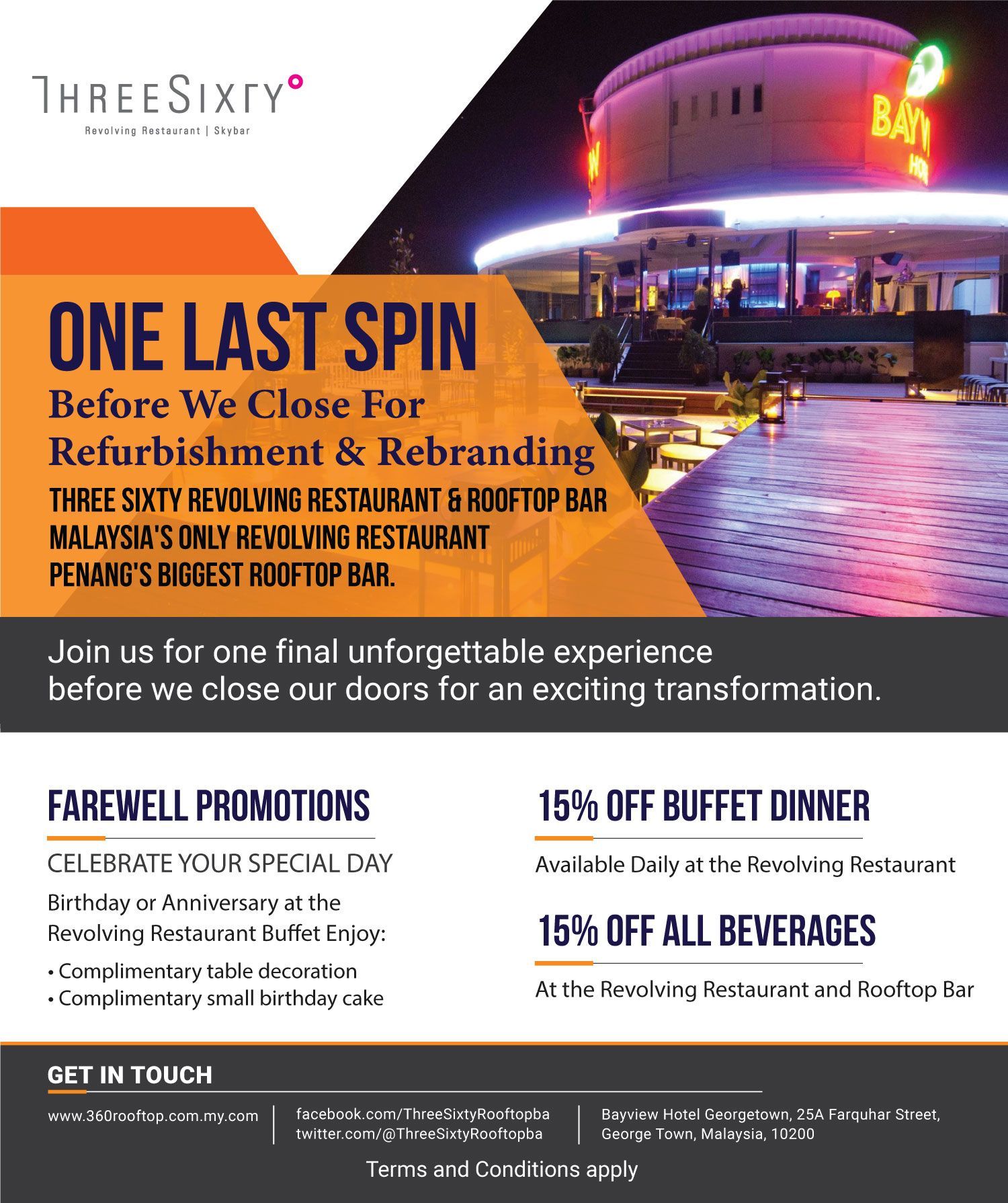 THE BEST SPOT IN GEORGETOWN TO TAKE IN THE BREATHTAKING VISTA OF THIS UNESCO WORLD HERITAGE CITY AND HER PORT IS THE BEST ROOFTOP BAR IN PENANG. WITNESS THE CITY’S TRANSITION FROM DAY TO NIGHT WHILE SIPPING INTERNATIONAL AND HOUSE COCKTAILS, COLD BEERS OR WINES TO THE SOUNDS OF UP-TO-DATE LOUNGE MUSIC ACCOMPANIED BY THE TROPICAL BREEZE